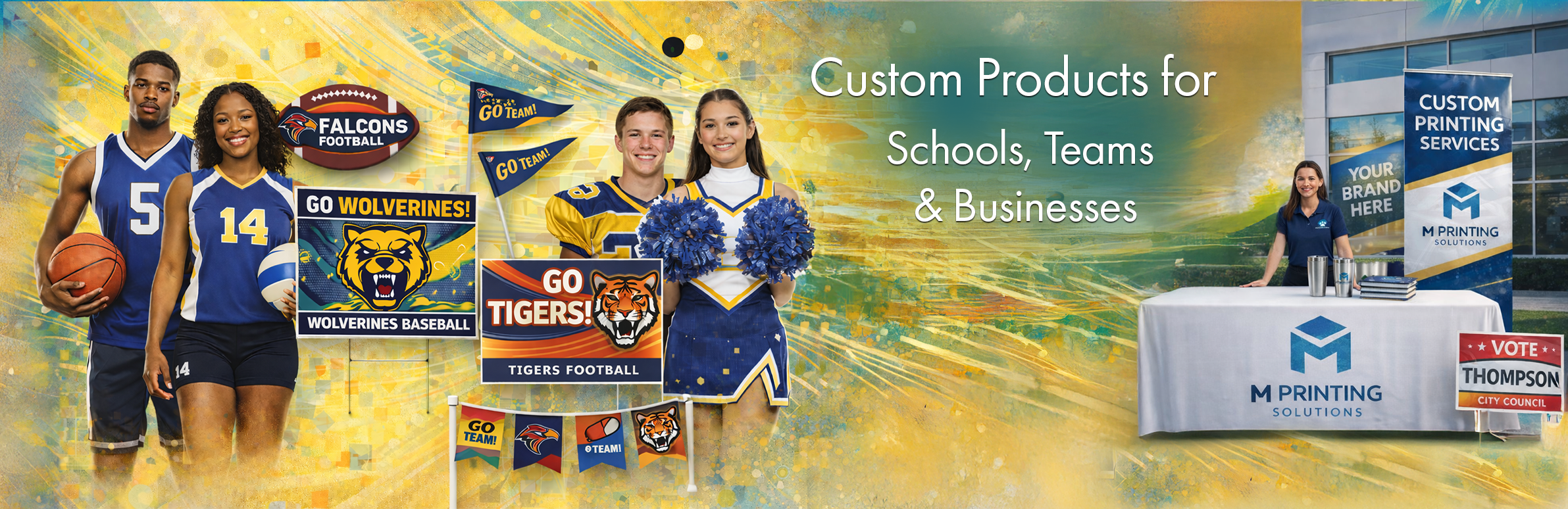 Product images shown are representative samples of customizable designs and branded merchandise. Final products are tailored to each school, team, business, or organization.